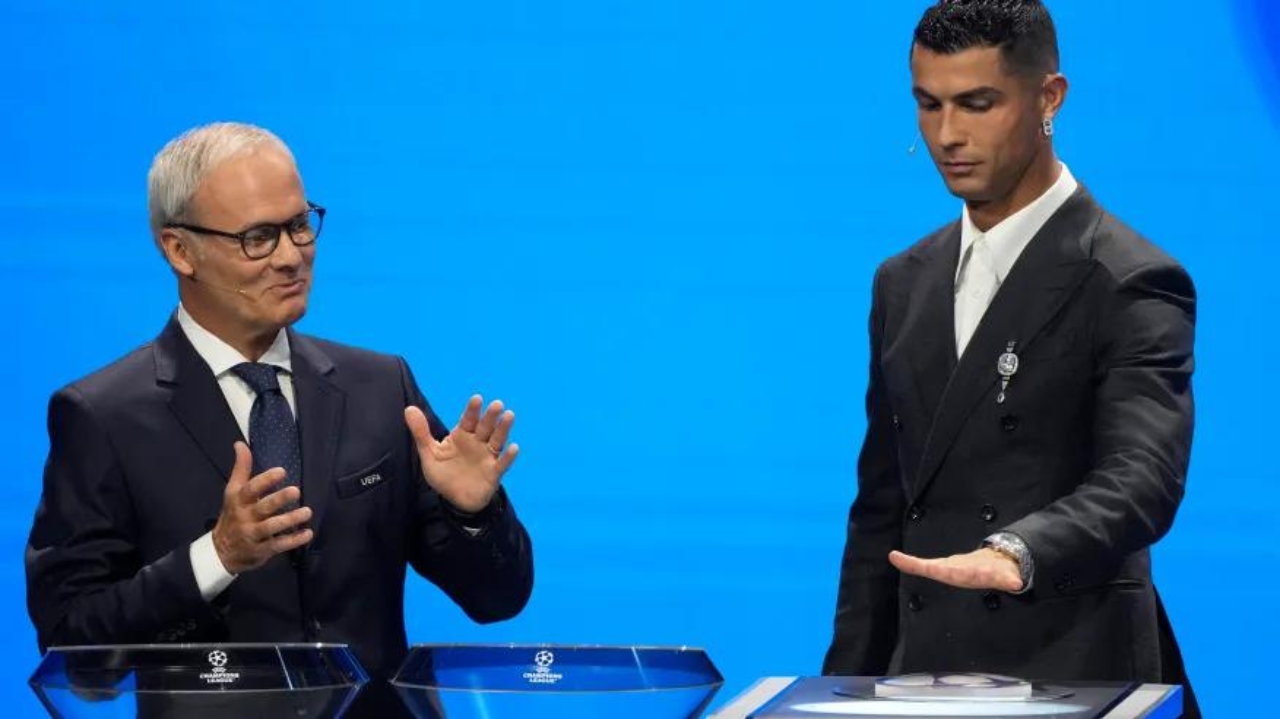 Foto destaque: Giorgio Marchetti á esquerda e Cristiano Ronaldo, à direita no sorteio da Uefa Champions League, temporada 2024/25 (Reprodução/Gregorio Borgia/AP Photo)