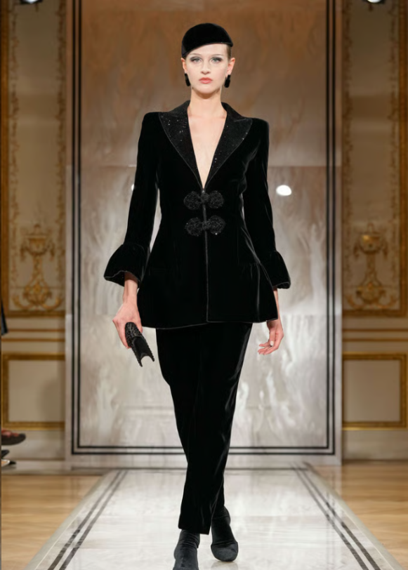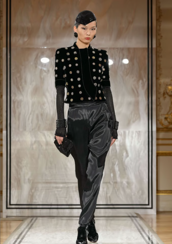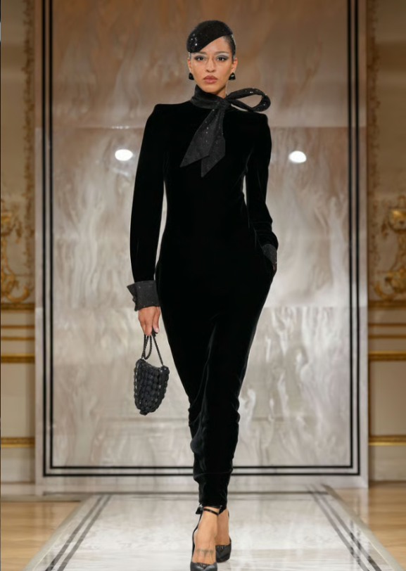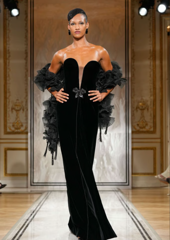 Quase todos os 77 looks do desfile foram desenvolvidos em tons de preto total, intercalando apenas texturas, pesos e brilhos para multiplicar sua leitura estética: os veludos densos, as sedas líquidas, o tule bordado, o zibeline opaco e também detalhes metálicos que se revezavam em diversas camadas de significados. A cor, frequentemente associada à sobriedade, ganhou aqui contornos sensuais, aristocráticos e até futuristas.