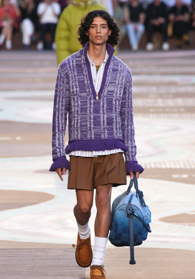Pharrell recorreu aos arquivos da maison para revisitar um capítulo icônico: as malas criadas em 2007 por Marc Jacobs para o filme “Viagem a Darjeeling”, de Wes Anderson. Com estampas de elefantes, girafas e coqueiros, os elementos gráficos foram reeditados não apenas nas bolsas, mas também em peças de vestuário, evocando uma estética nostálgica e artesanal, que conversa tanto com o cinema quanto com o turismo de luxo.