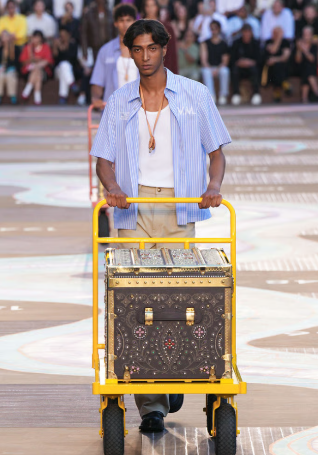 O cenário, assinado pelo arquiteto Bijoy Jain, do “Studio Mumbai”, antecipava a fusão que viria: uma coleção que conecta elementos da estética indiana com os códigos históricos da Louis Vuitton, agora mediados pelo olhar contemporâneo e urbano de Pharrell.